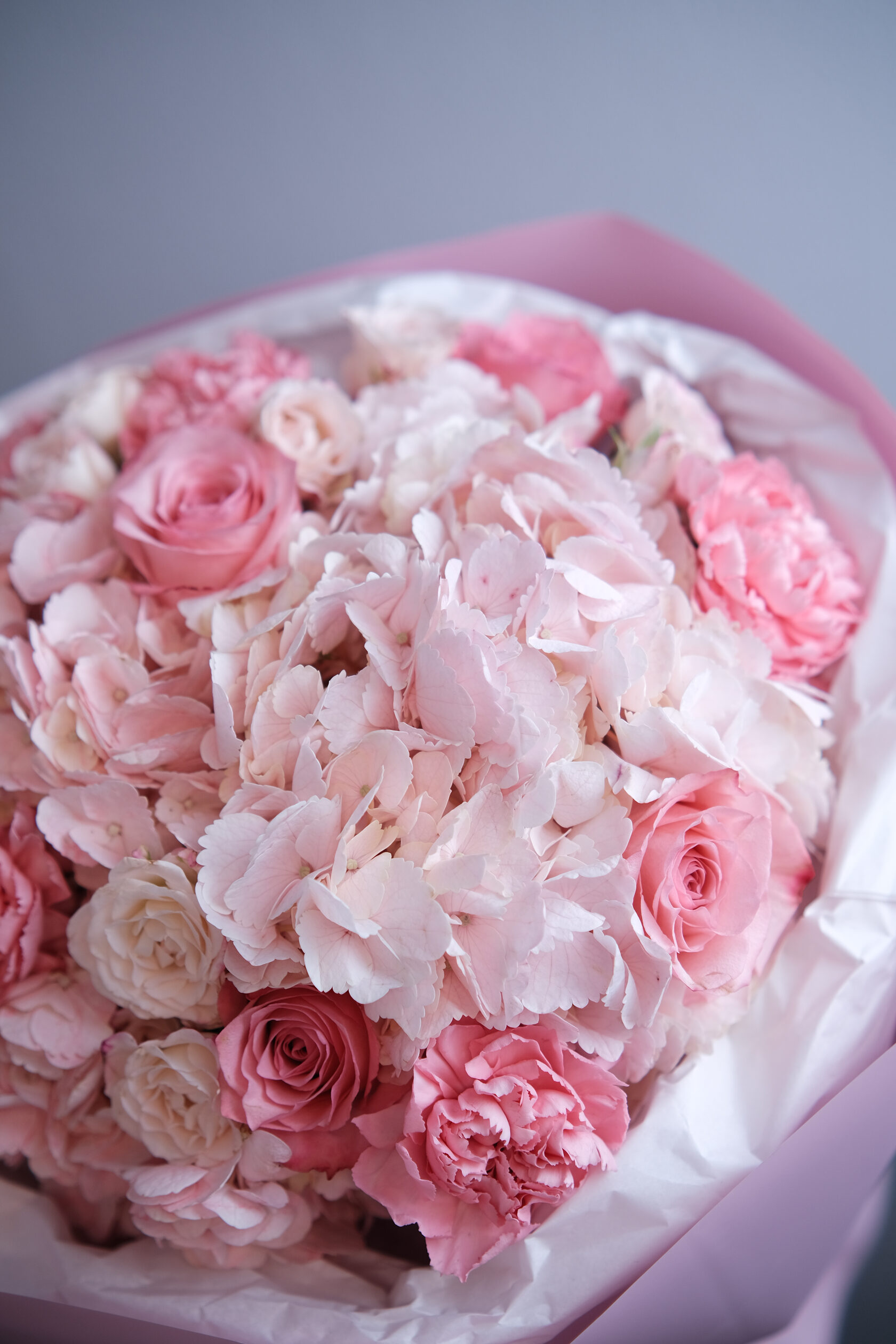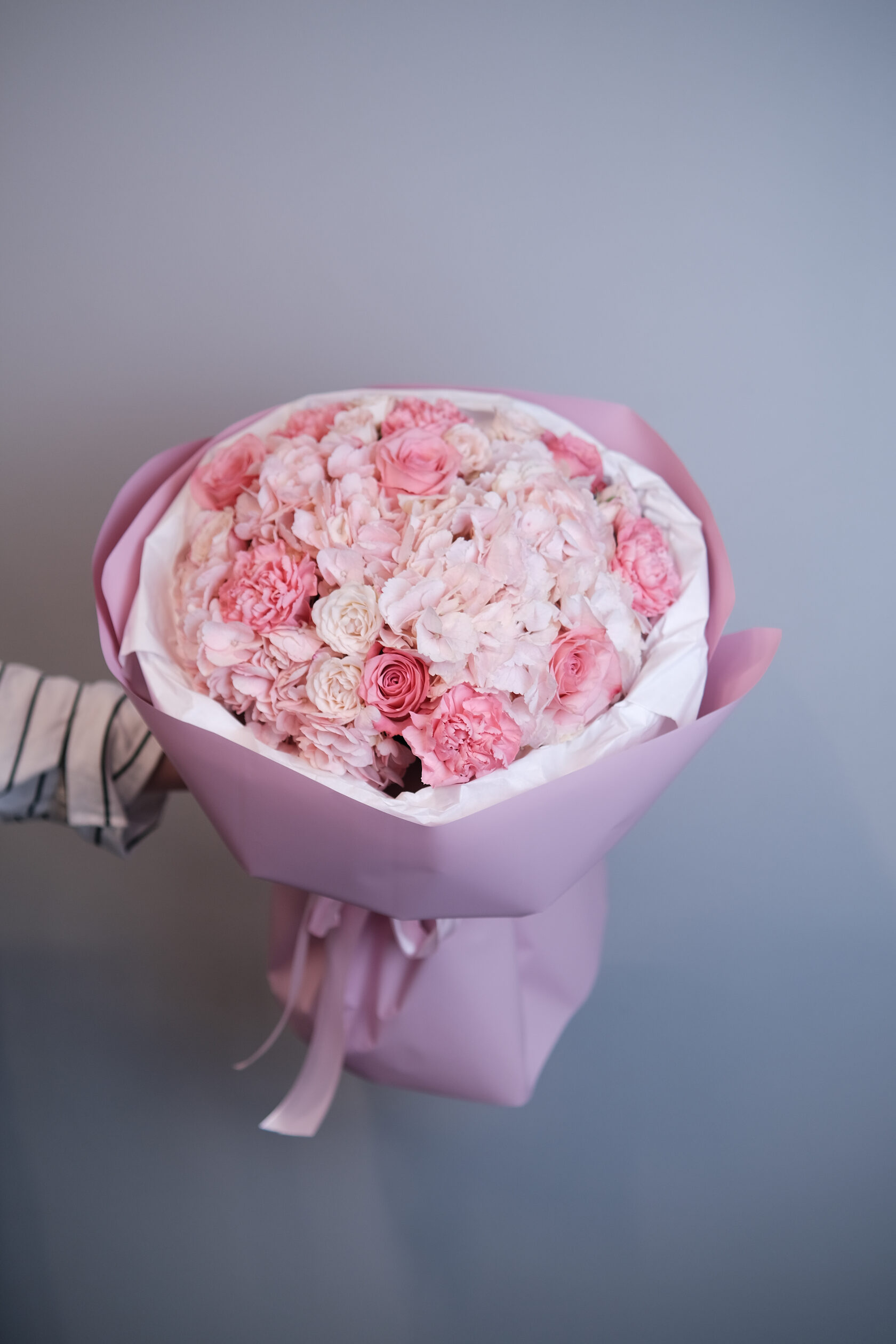 Гигантская композиция в корзине в нежных оттенках с акцентами в виде прекрасной гортензии. *Наши флористы соберут для вас максимально похожий букетик/композицию.