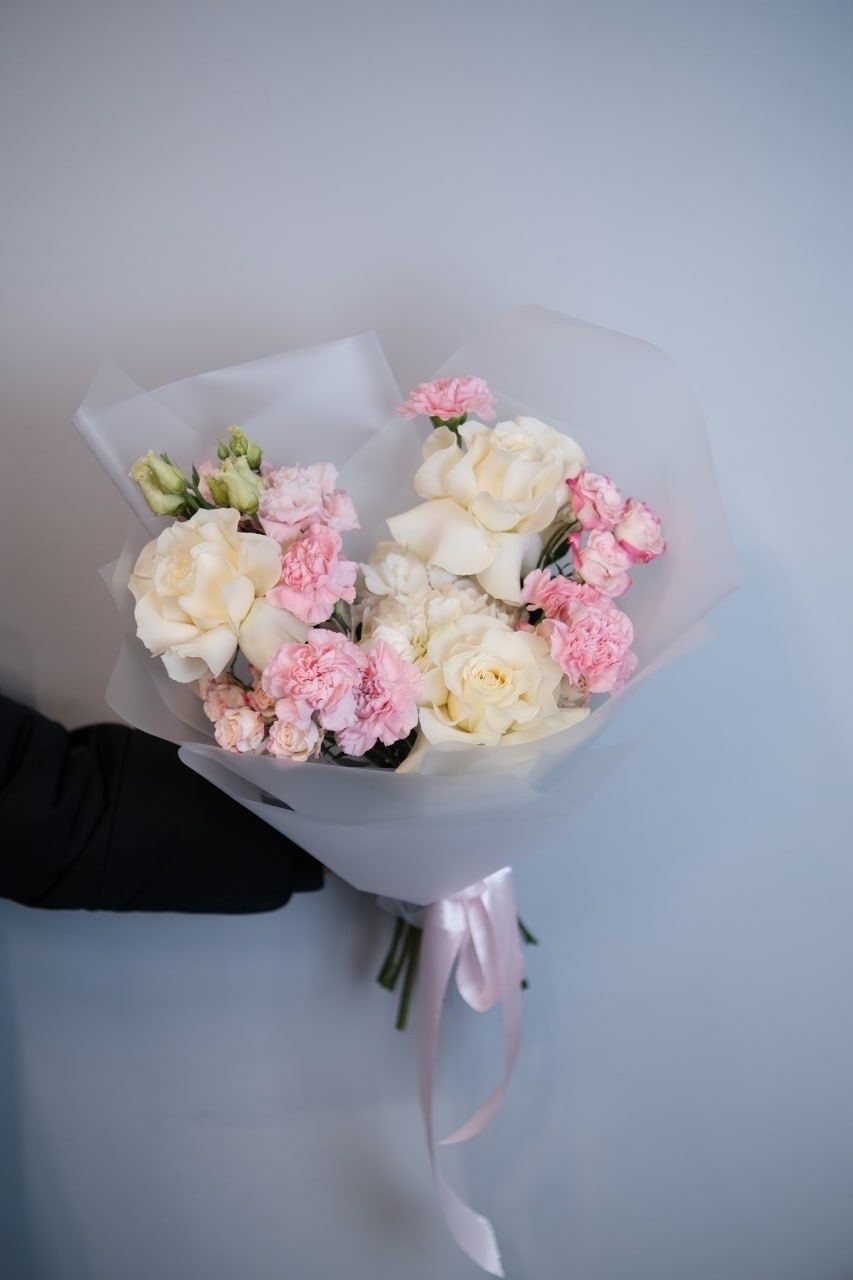 Букет в белых тонах с яркими акцентами обычно ассоциируется с элегантностью, чистотой и нежностью. *Наши флористы соберут для вас максимально похожий букетик/композицию.
