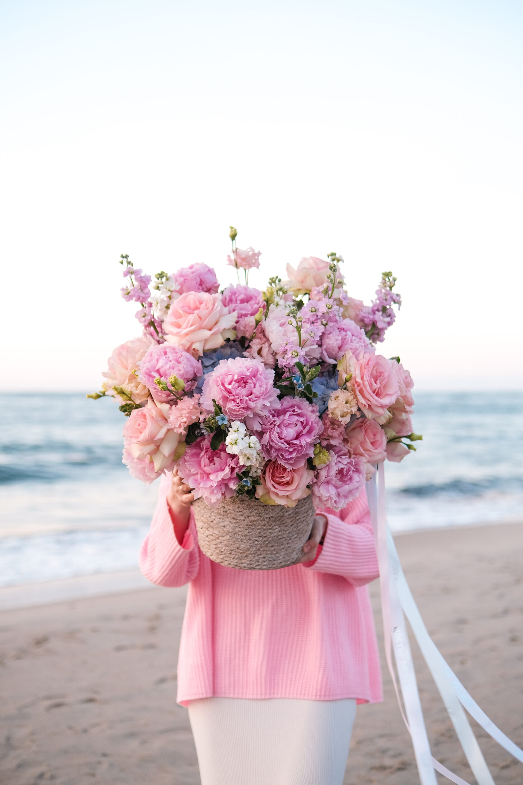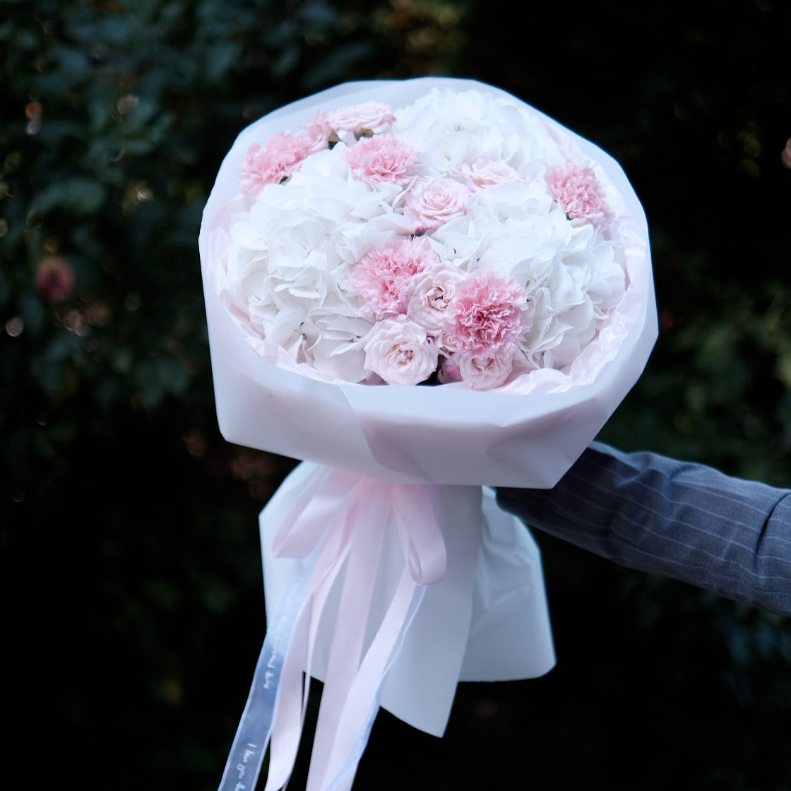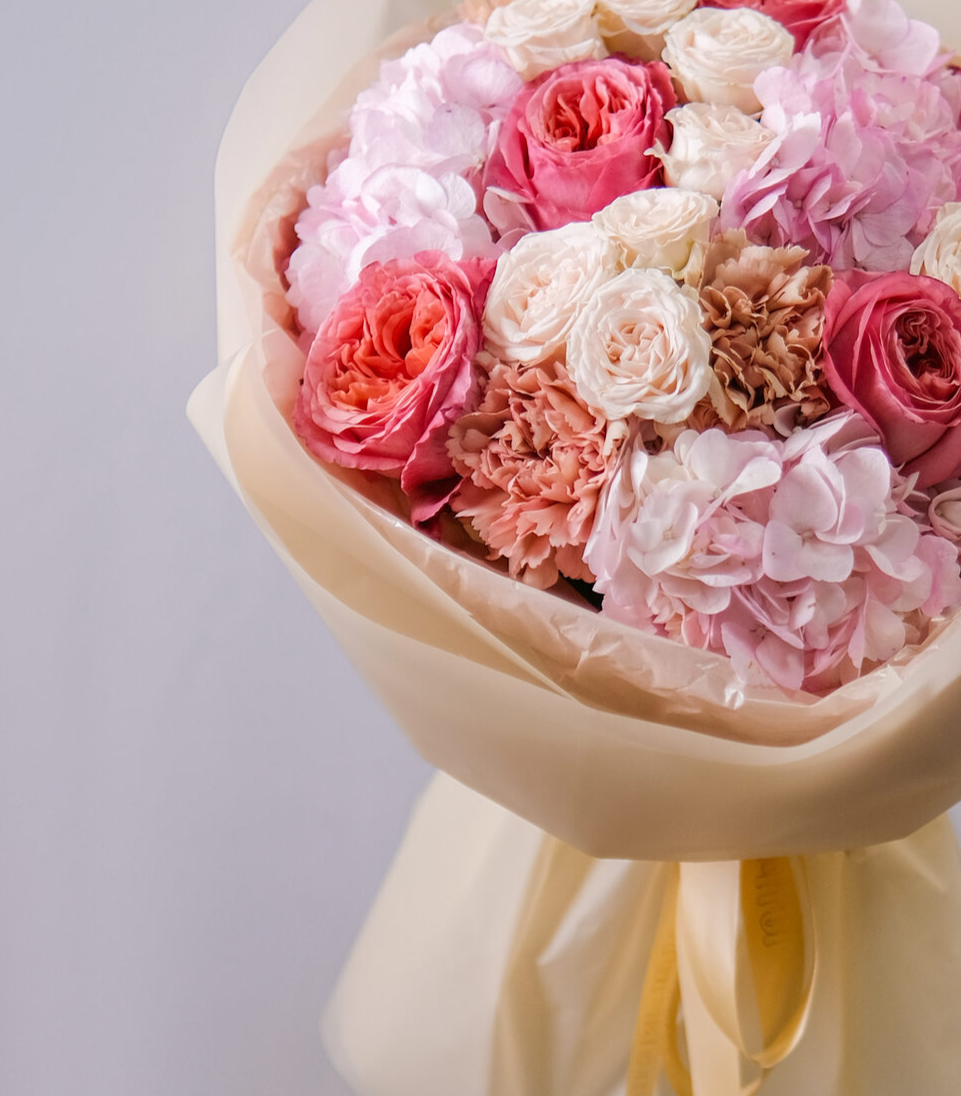 Гигантская композиция в корзине в нежных оттенках с акцентами в виде прекрасной гортензии. *Наши флористы соберут для вас максимально похожий букетик/композицию.