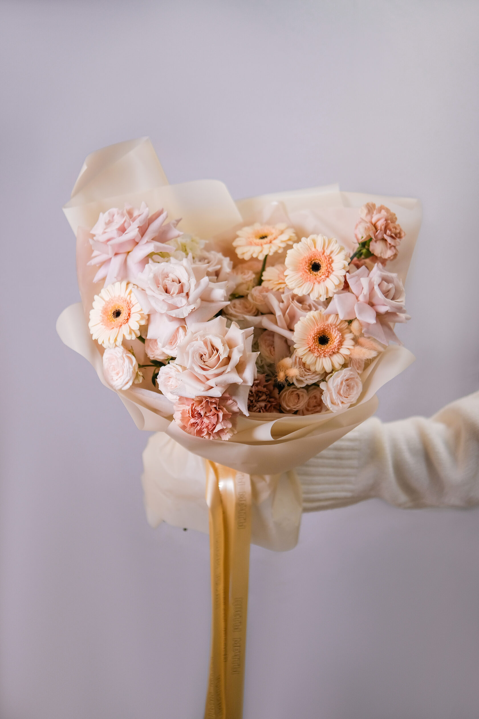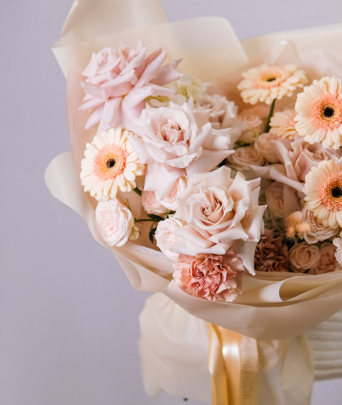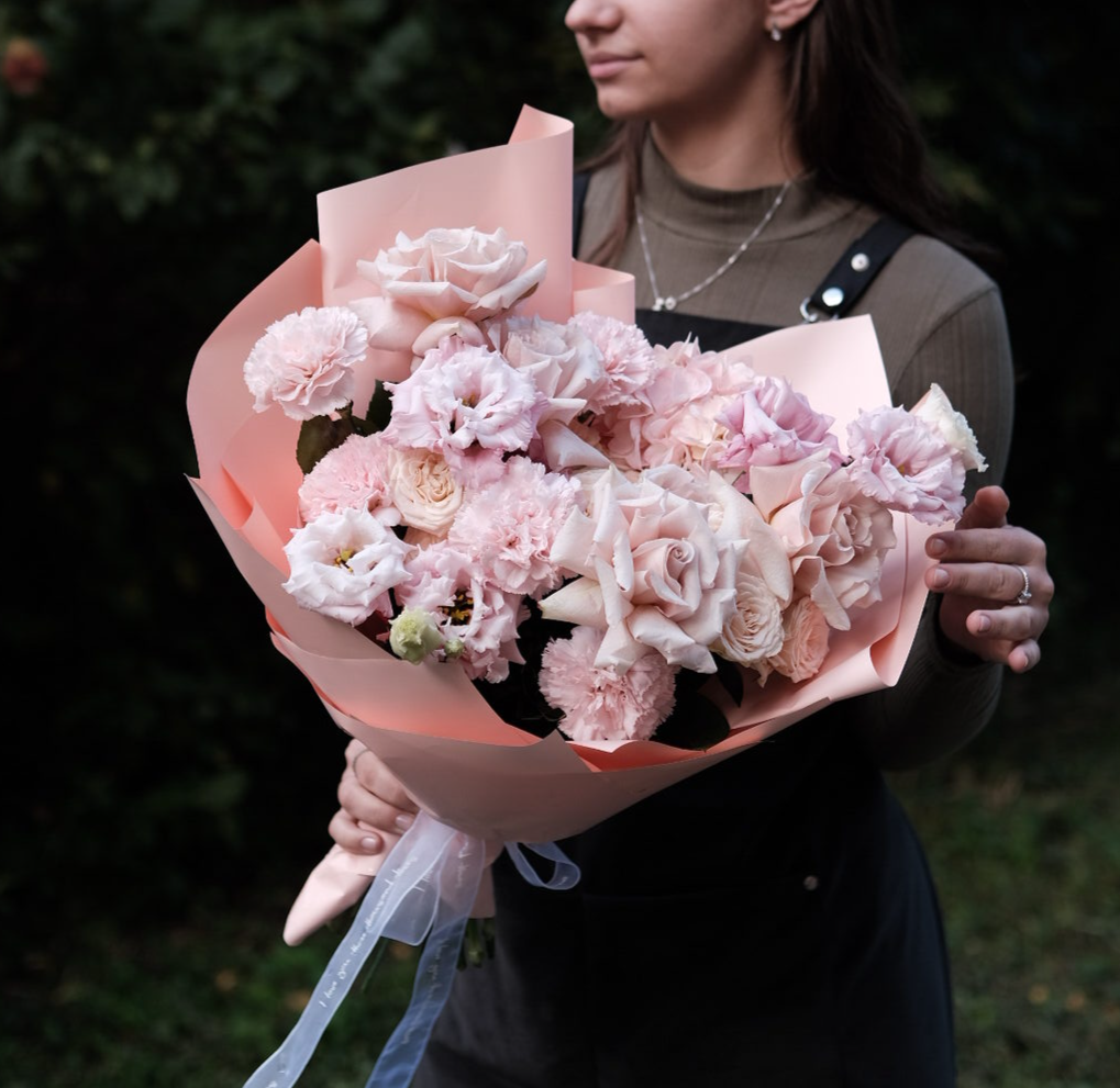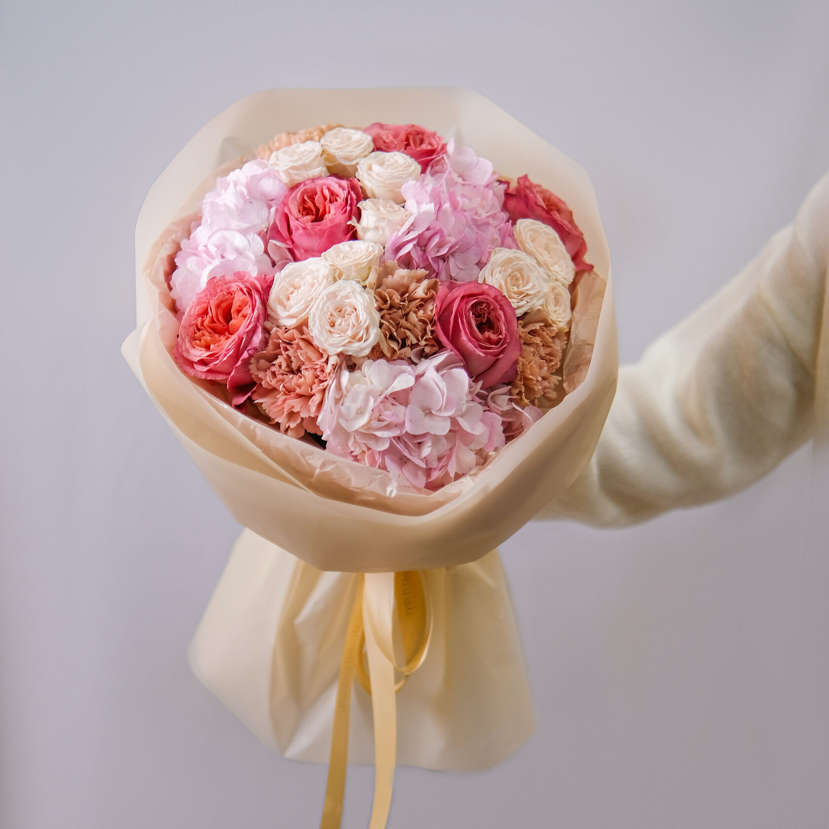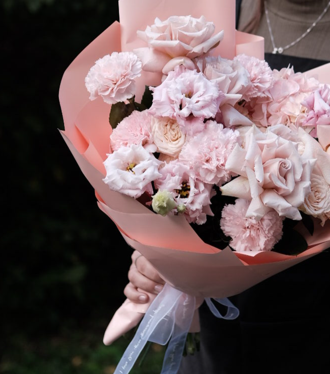 В этой композиции собралась вся нежность на свете: от розовой гвоздики до персиковой кустовой розы *Наши флористы соберут для вас максимально похожий букетик/композицию.