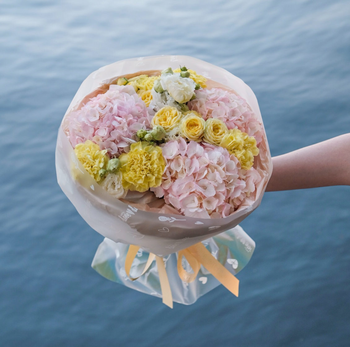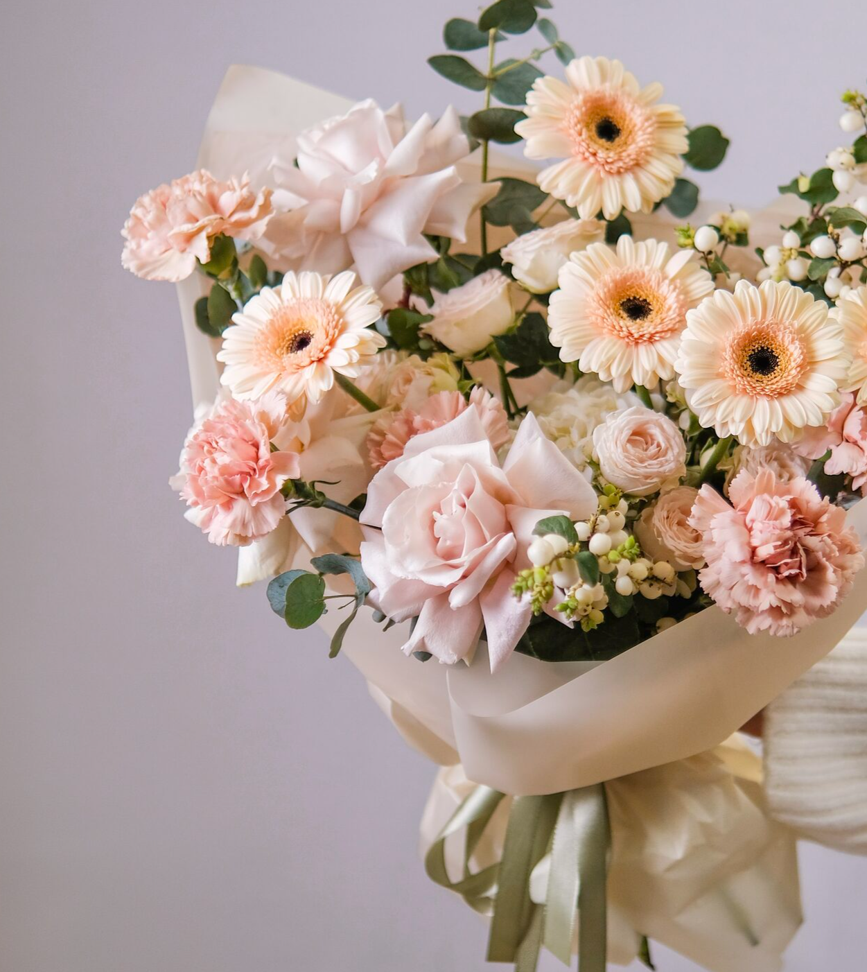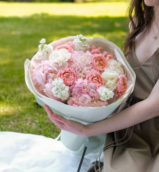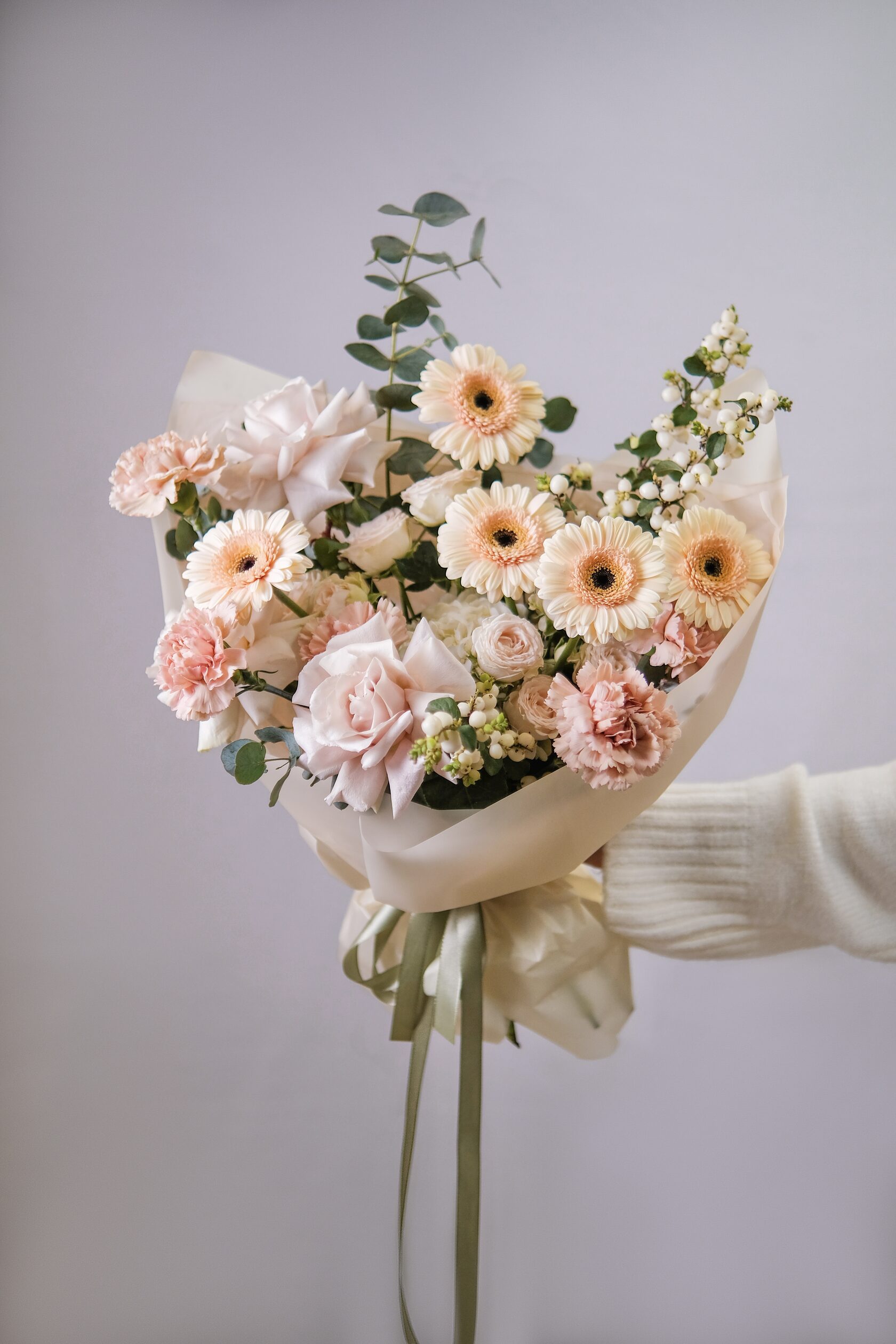 В этой композиции собралась вся нежность на свете: от розовой гвоздики до персиковой кустовой розы *Наши флористы соберут для вас максимально похожий букетик/композицию.