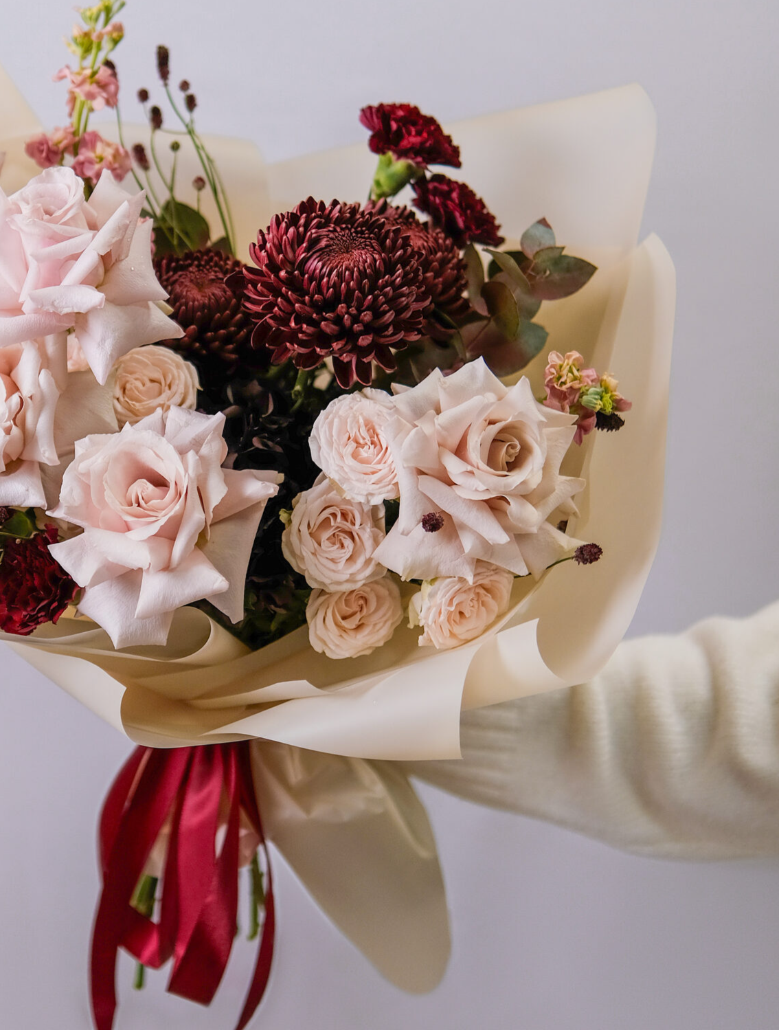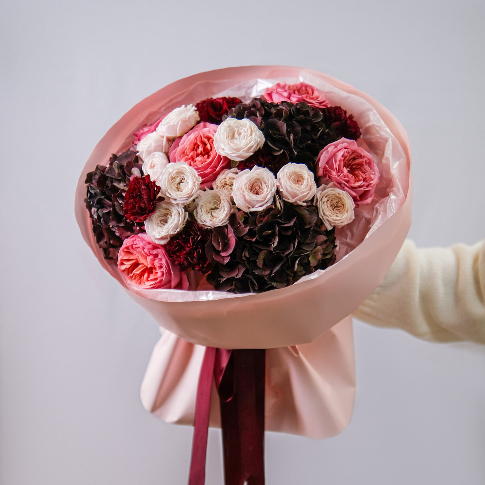 Французская роза, вывернутая нашими флористами идеально дополняет эту композицию. *Наши флористы соберут для вас максимально похожий букетик/композицию.