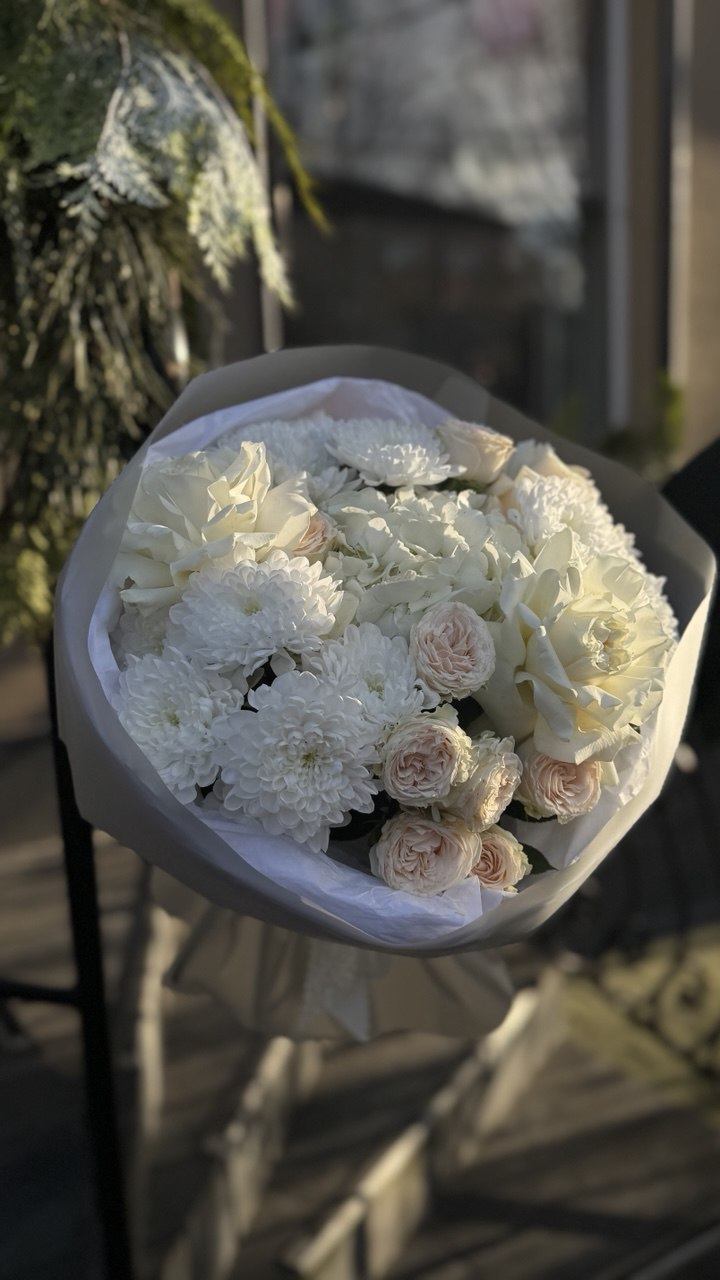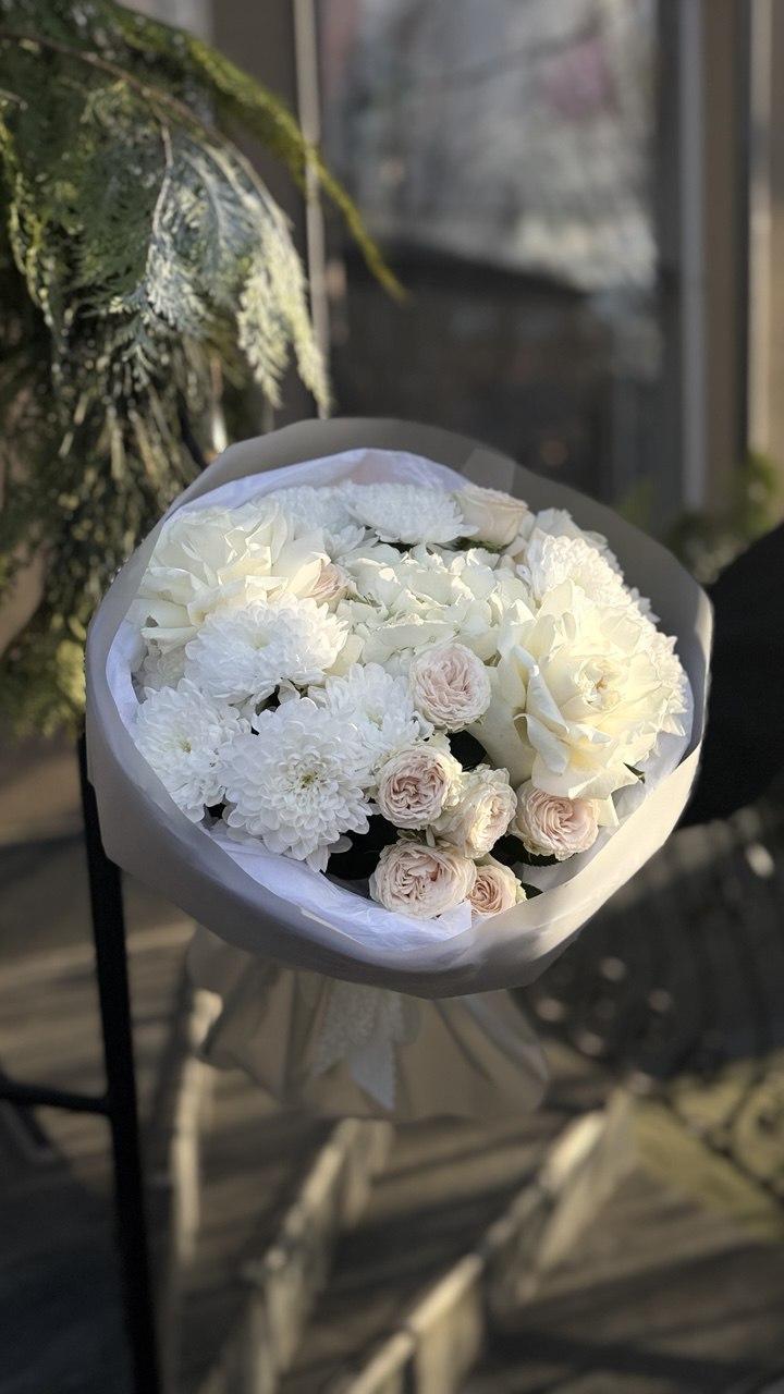 Букет в белых тонах с яркими акцентами обычно ассоциируется с элегантностью, чистотой и нежностью. *Наши флористы соберут для вас максимально похожий букетик/композицию.